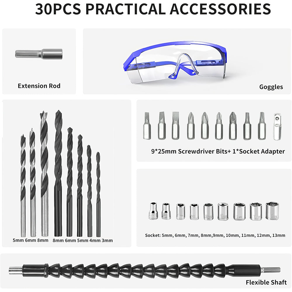 - Included Accessories: 65-piece kit: drill bits, screwdriver bits, sockets, socket adapter, extension rod, flexible shaft, goggles, user manual, magnetic bit holder, flexible shaft
