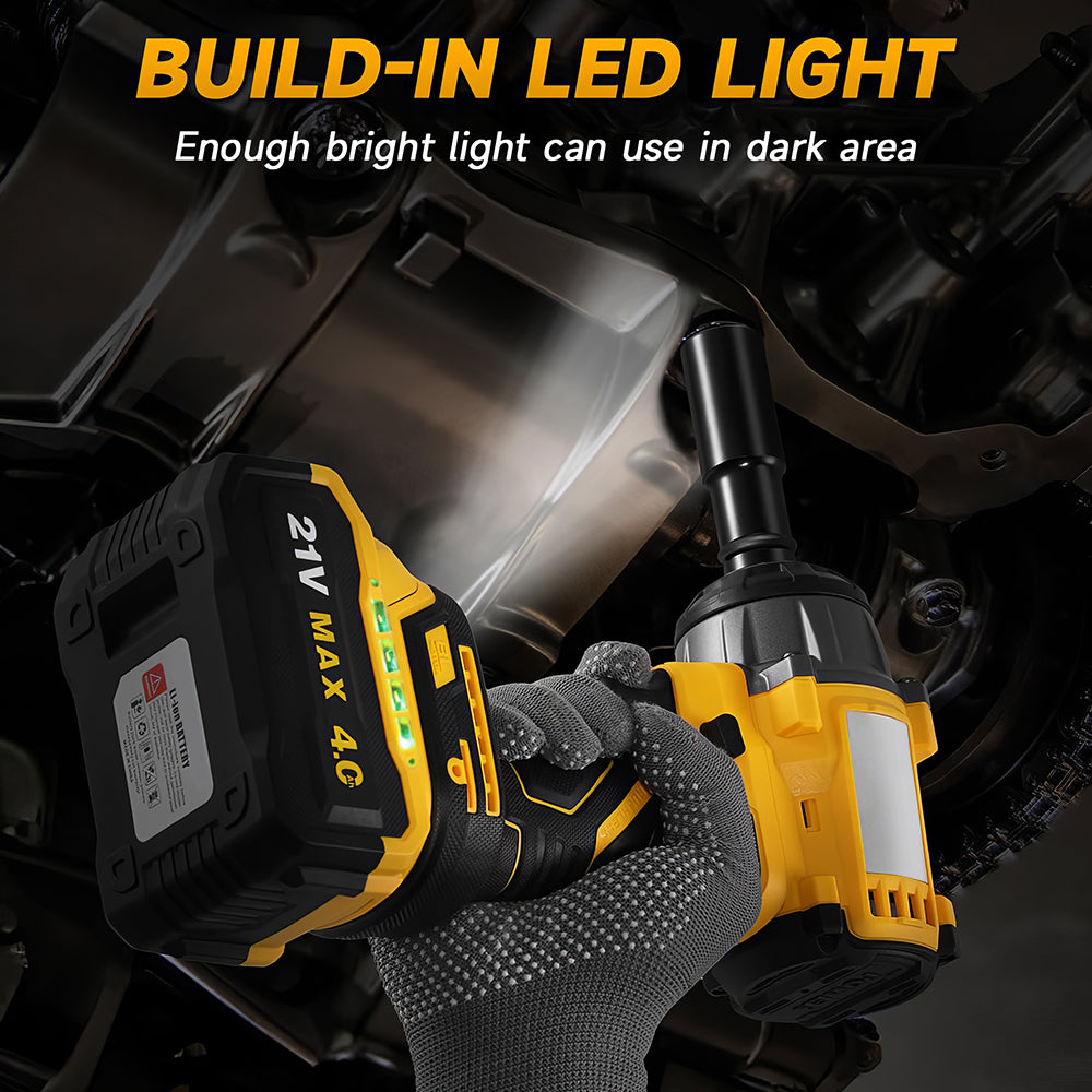 This cordless impact wrench delivers up to 479 foot pounds of torque powered by a brushless motor for maximum efficiency and durability. With a 21V 4.0Ah battery and fast charger, it offers long runtime and quick recharging. The lightweight and ergonomic design allows for easy handling, making it ideal for car maintenance, home improvement, and DIY projects. Includes sockets and a carrying case.