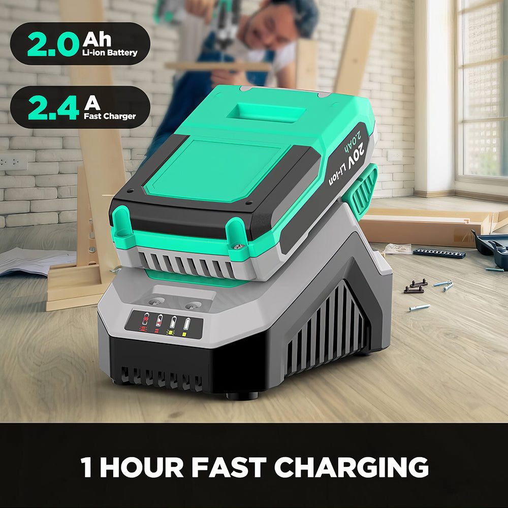 Includes 2.0 Ah battery, fast charger, socket adapters, and driver bits